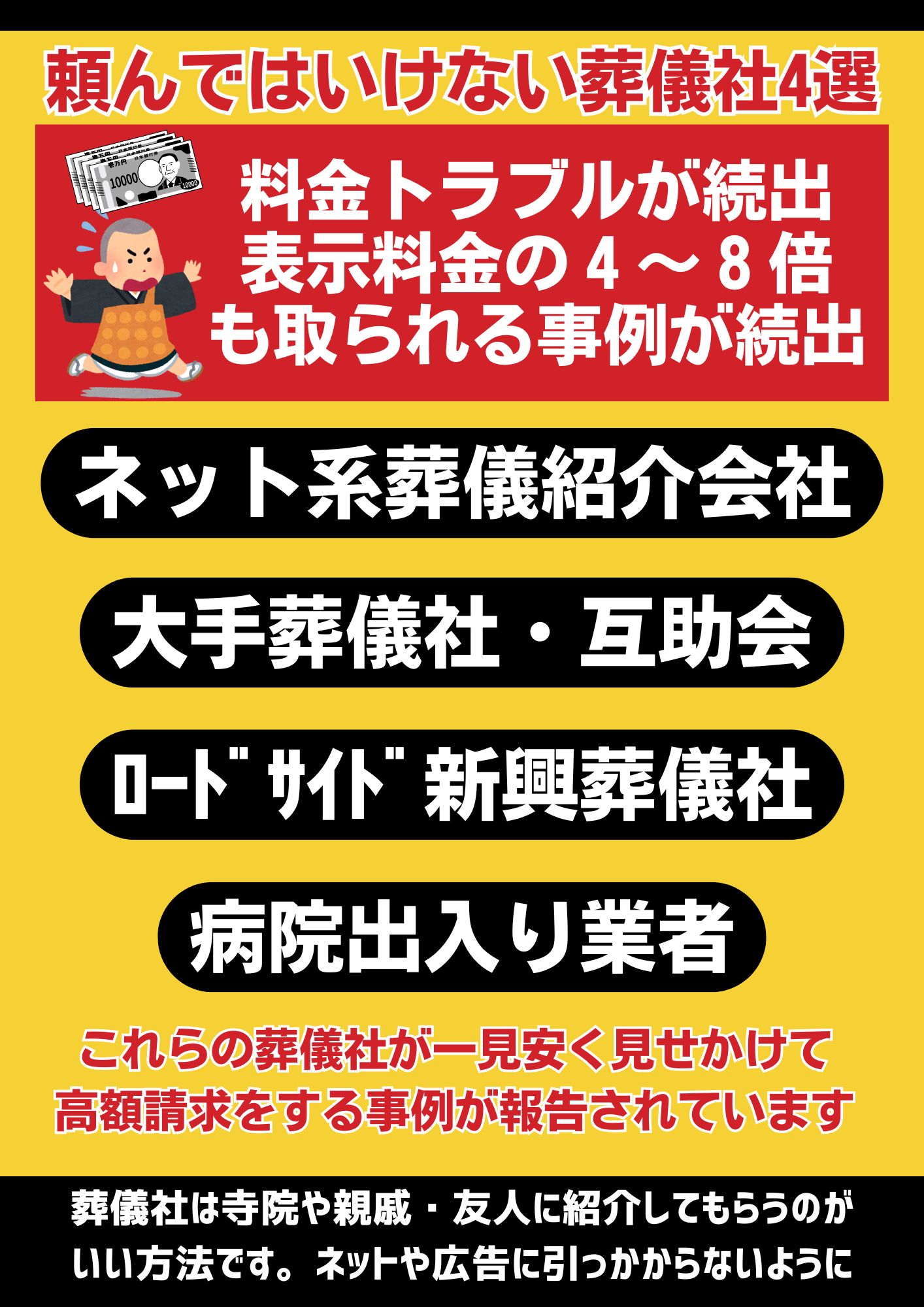 | ・また自社のクレジットカードで葬儀費用を支払えばポイントが付いてお得ですと宣伝したり、テレビやインターネットではいくつかの葬儀社紹介業(葬儀社を紹介するだけの仲介業者)が活発に宣伝をしていますので、従来の葬儀社と混同してそのような会社に葬儀を依頼する方が増加しています。 |