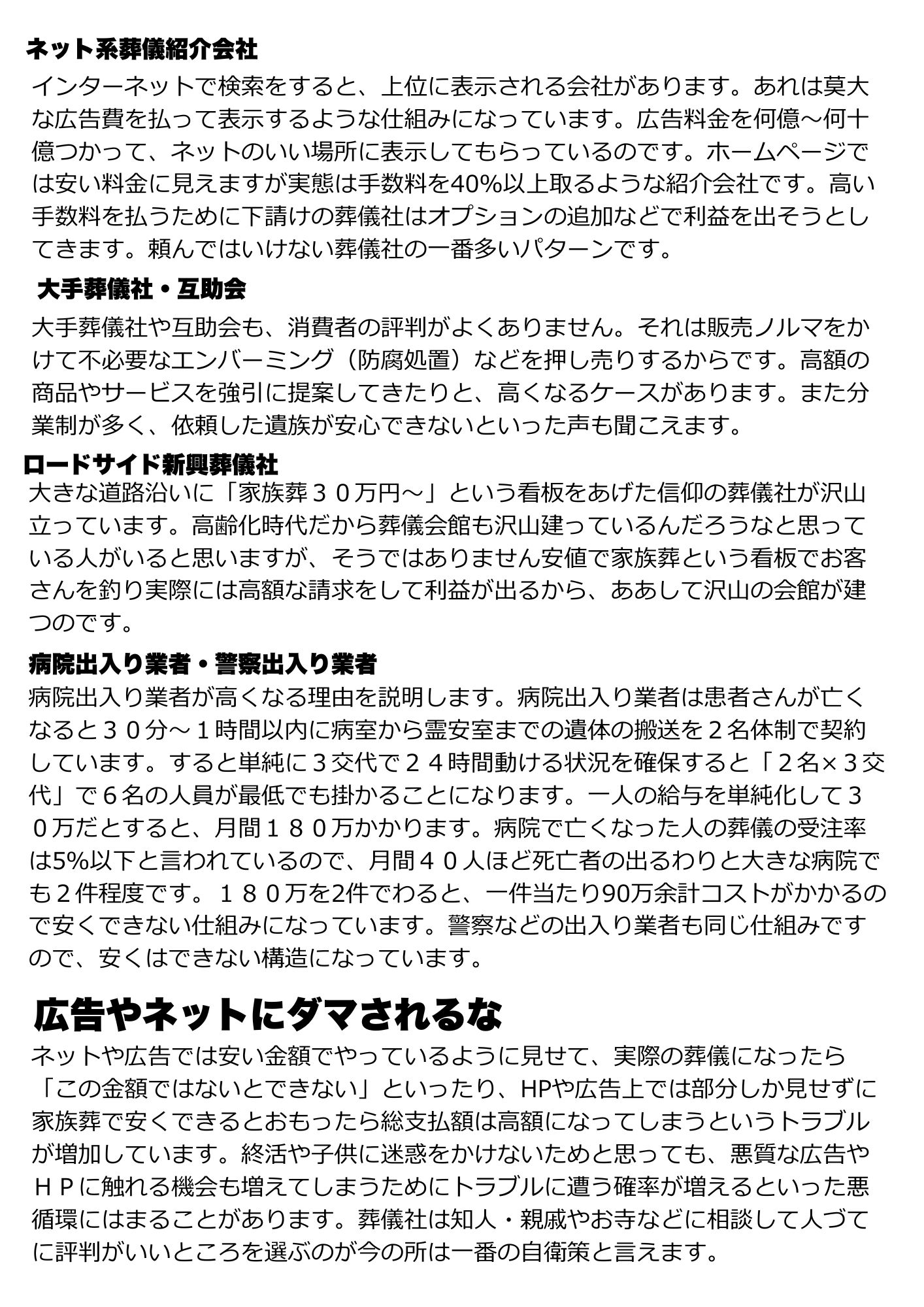 | ・「新聞のチラシには『家族葬○○万円~』となっていたのに実際には百万円以上かかってしまった。」 |